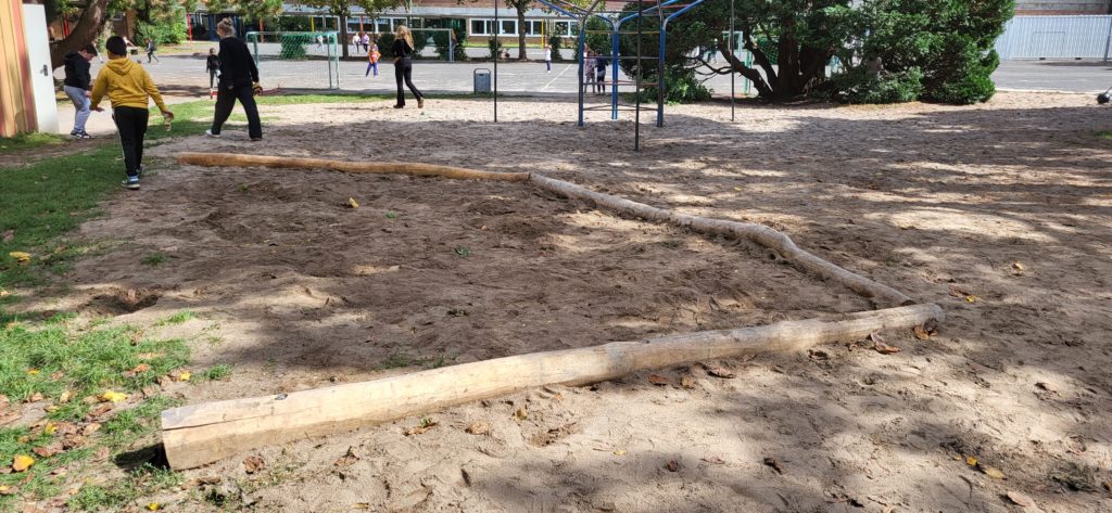 Außerdem wurde auf dem Spielplatz mit riesigen Robinienstämmen eine Buddelzone gebaut, in der nun nach Herzenslust im Sand gebuddelt werden kann.