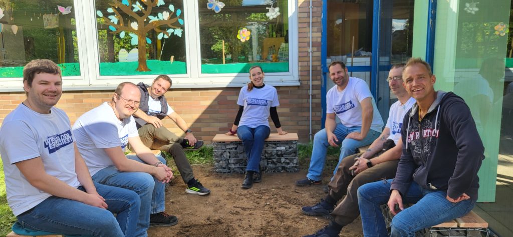 Am 12.09.2025 tat sich etwas auf dem Schulhof, das merkten die Kinder gleich früh am Morgen:  Ein aufgestellter Tisch mit Essen und Trinken gab Anlass zu Spekulationen. „Das ist heute für besondere Gäste!“, erklärte Herr Tewes den Kindern. Die „Gäste“ kamen von der Delkenheimer Firma Blecon GmbH und kamen zum Arbeiten vorbei. Im Rahmen des Projektes „Wiesbaden engagiert“ errichteten die Mitarbeiter eine kleine Leseecke, damit die aus dem Bücherschrank ausgesuchten Bücher auch an einem geeigneten, schönen Plätzchen gelesen werden können.